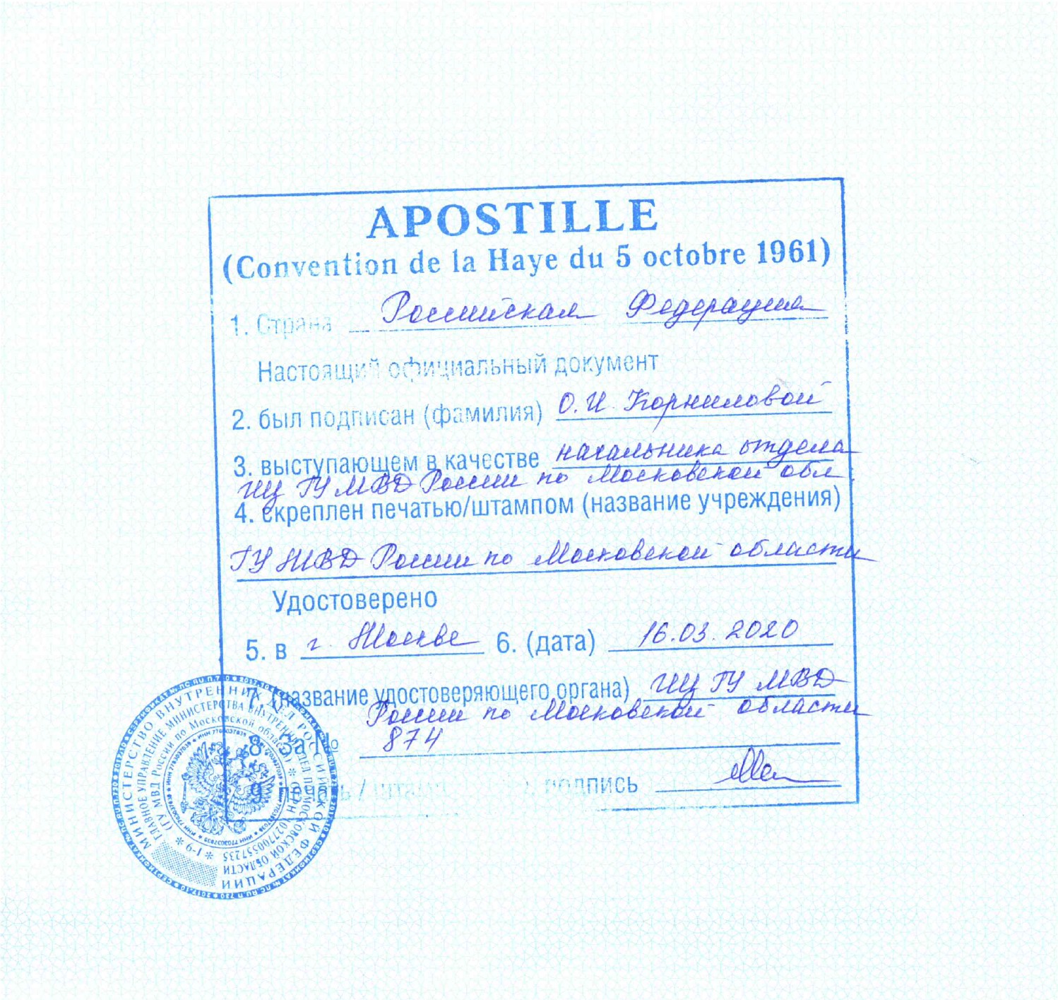 Проставляет штамп «Апостиль» на оригиналы документов, выданных главными информационно-аналитическими центрами МВД по России. В основном речь идет о справках об отсутствии (наличии) судимости.