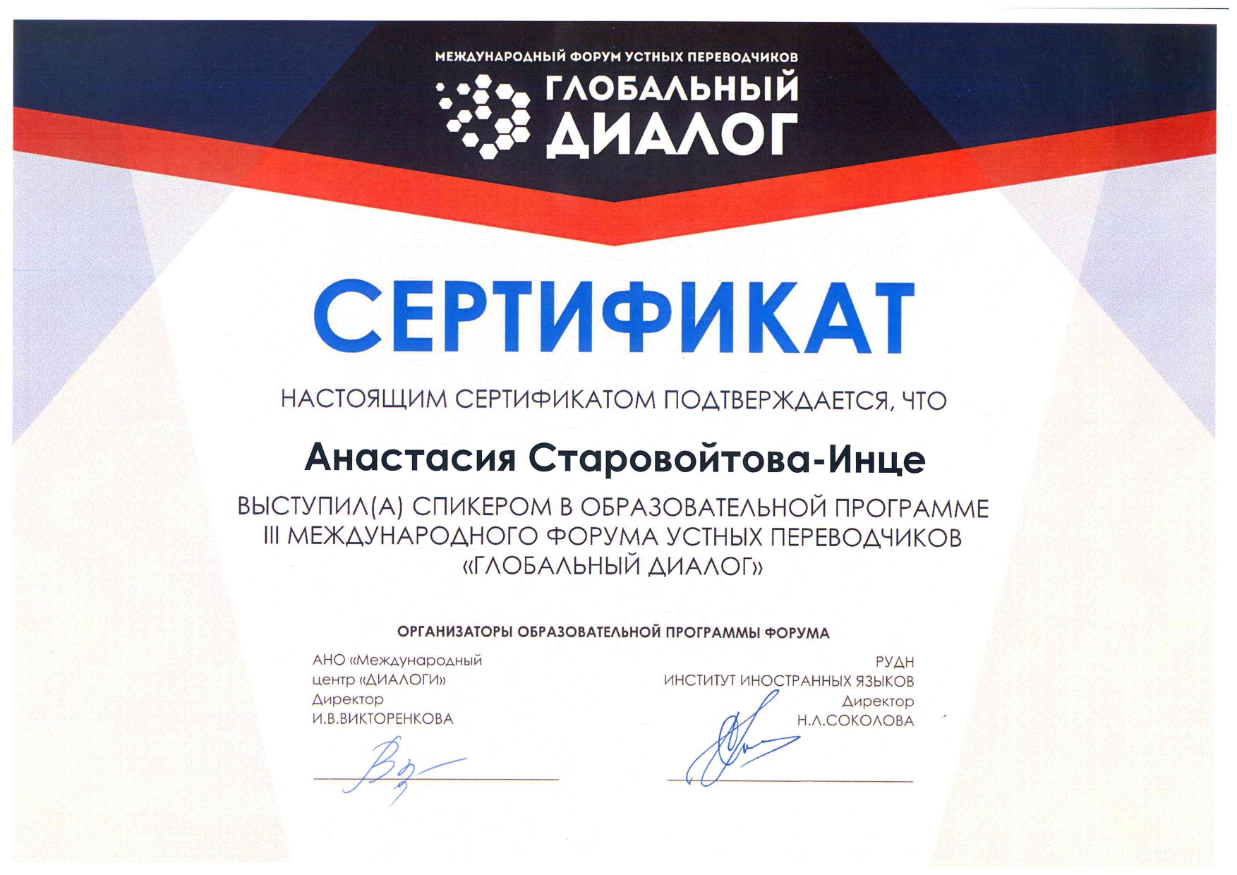 Кроме того, в рамках образовательной программы Форума руководитель компании Старовойтова-Инце Анастасия провела мастер-класс на тему «Договор в работе устного переводчика» и в рамках круглого стола с представителями академической части переводческого сообщества выступила с обзором проблем, с которыми, как правило, сталкивается переводческая компания при подборе и работе с переводчиками редких языков или языков стран СНГ.